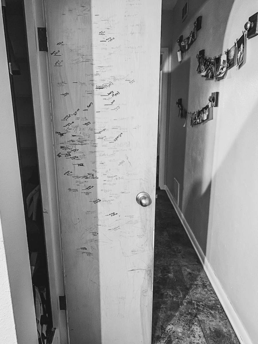 A mile out of town sits a little farmhouse on my family’s farm. I grew up in that farmhouse just like my dad and his siblings. My parents built a new house and moved when I was a sophomore in college. My cousin and his wife and their kids moved into the farmhouse. Then a few years later my sister and her family moved in and are now raising their 3 little babes there. Inside that farmhouse is a door to a closet. And on the inside of that door are close to 100 names. That door holds the names, dates, and heights of family and friends. Ranging all the way from when my dad was young to today. I love that door.