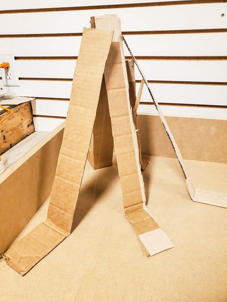 Next was the volcano. Cohen has been asking for a volcano. I found several plastic ones online I could buy but decided I didn’t want to spend the money and could make my own. Insert Paper Mache. I first cut strips of cardboard and glued them to the base.
