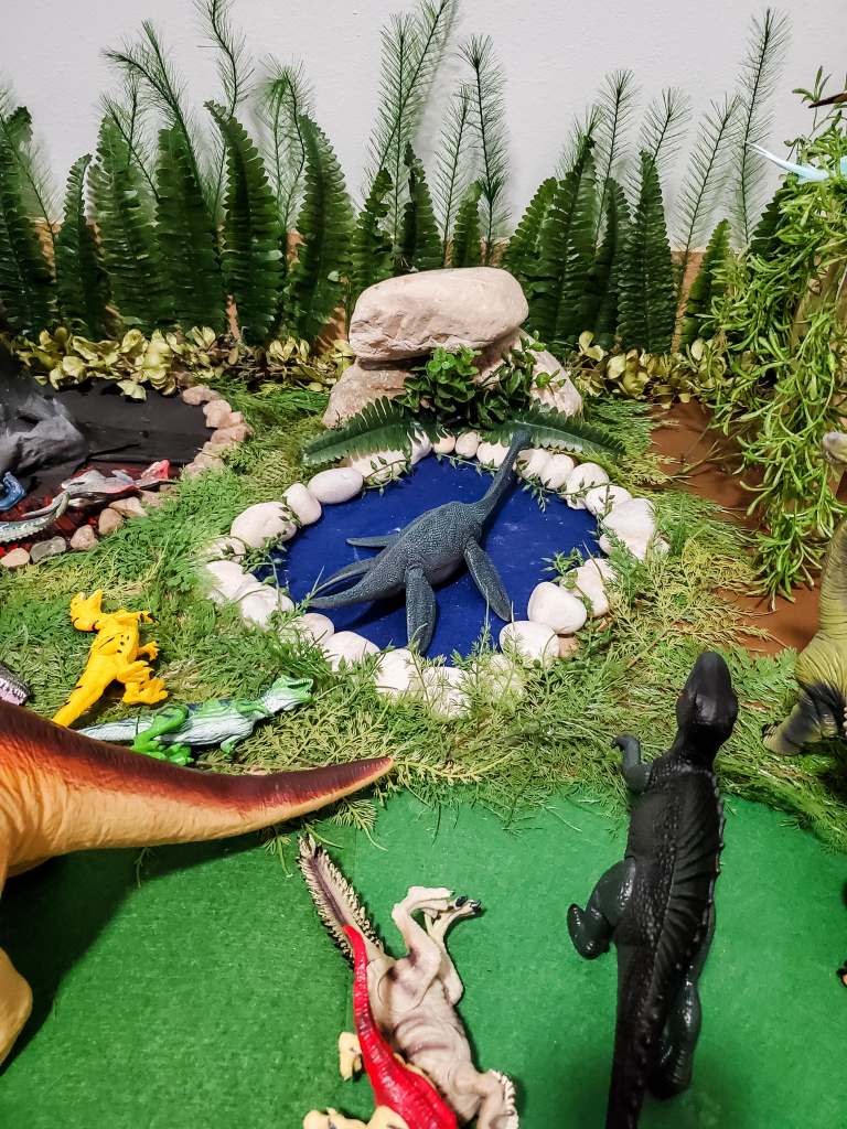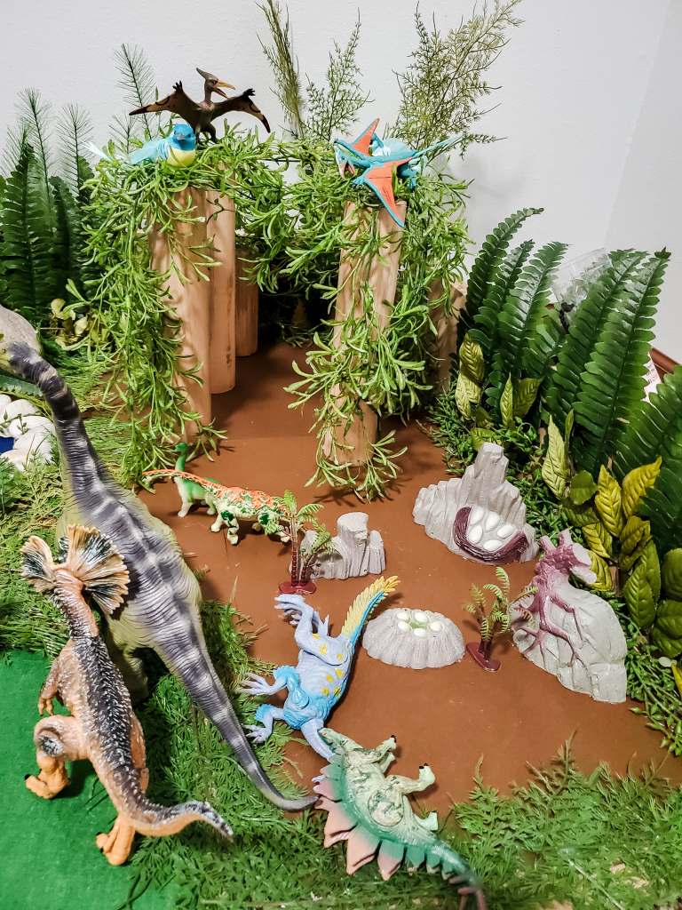 To say he is slightly obsessed would be an understatement. I am amazed at how knowledgeable he is. When we read his dino books I have to check the facts he rattles off to see if he’s right. He usually is. We had a pretty easy going birthday party with family. And it was, as you can guess, full of dinosaurs. I had an idea to create a dinosaur habitat for him to play with. So with a lot greenery from hobby lobby and many hot glue gun sticks, I was able to pull it off.
