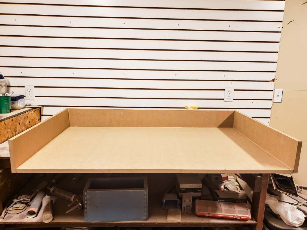 The base is built out of MDF board. I measured the doorways to make sure we could get it from the garage to his room and also the space available in his room. Zach built the base and added sides. When looking at images of similar projects the sides were always much higher. But I didn’t think I needed that. I just needed something to glue the greenery to.