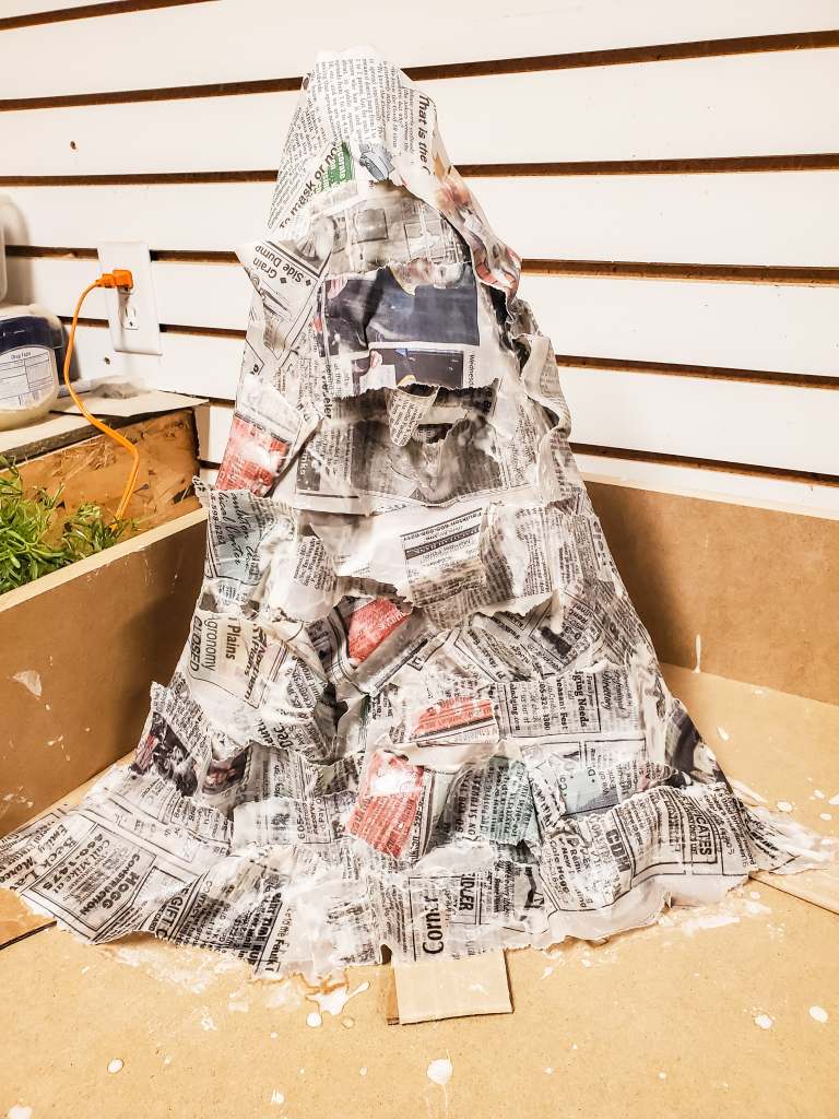 Next I cut a newspaper up into several strips. The paper mache recipe I used was a 2:1 ratio of hot water to flour. I did 1 thin layer and let it dry.